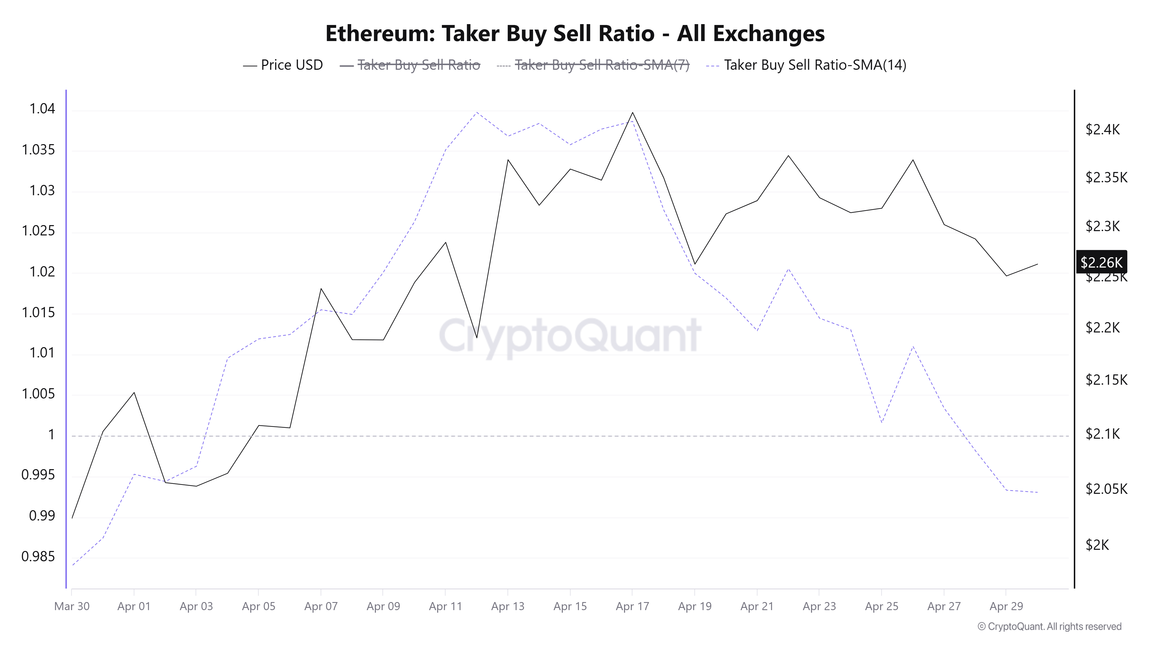 This is evident in the Ethereum futures market, where the taker buy-sell ratio has fallen into negative territory. The metric measures the difference in trading volume between traders purchasing ETH perpetual contracts with market orders. Its 14-day moving average has been declining since mid-April, falling below its neutral level earlier in the week.