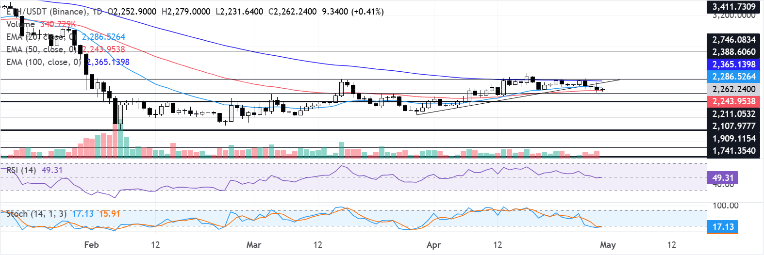 On the daily chart, ETH maintains a mildly bearish near-term bias as price holds below the 20-day Exponential Moving Average (EMA) at $2,287 and the longer-term 100-day EMA near $2,365.