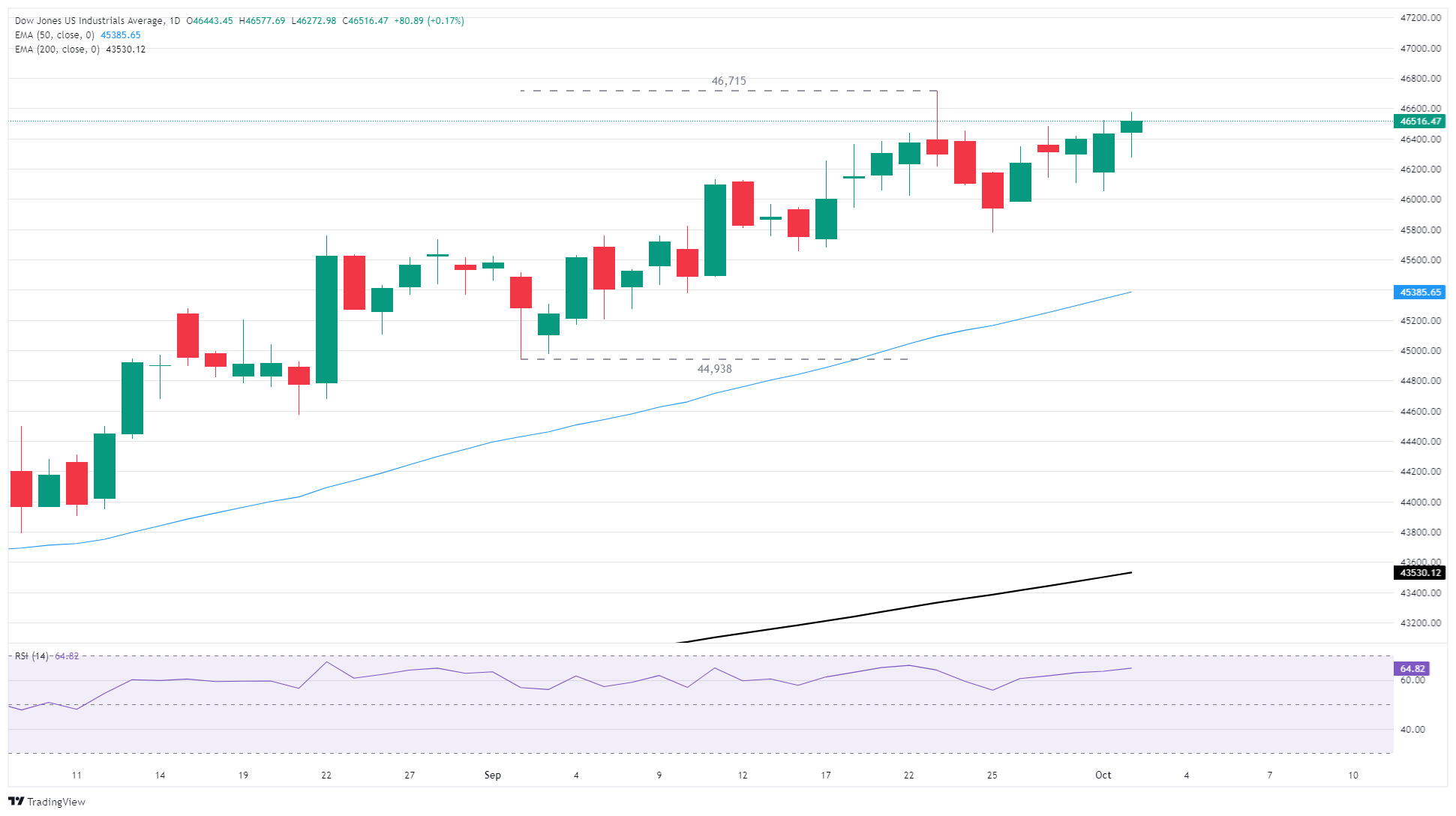 Chỉ số công nghiệp trung bình Dow Jones (DJIA) đã phẳng vào thứ Năm, bám sát gần khu vực 46.500 khi thị trường chứng khoán chờ đợi để vượt qua tình trạng đóng cửa của chính phủ liên bang Mỹ. Lượng dữ liệu về lao động và tiền lương quan trọng của Mỹ trong tuần này khó có khả năng được công bố sau khi Cục Thống kê Lao động (BLS) cảnh báo rằng việc đóng cửa chính phủ sẽ dẫn đến báo cáo việc làm Bảng lương phi nông nghiệp (NFP) mới nhất bị trì hoãn hoặc tạm dừng cho đến khi hoạt động của chính phủ trở lại.