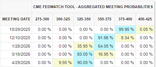 Theo Công cụ FedWatch của CME, thị trường lãi suất đã hoàn toàn định giá cho một đợt cắt giảm lãi suất tiếp theo vào ngày 29 tháng 10, với xác suất trên 90% cho việc cắt giảm lãi suất lần thứ ba liên tiếp vào ngày 10 tháng 12. Các nhà giao dịch lãi suất cũng đang kỳ vọng Fed sẽ thực hiện một đợt cắt giảm lãi suất thêm một lần nữa vào tháng 3 hoặc tháng 4 năm sau.