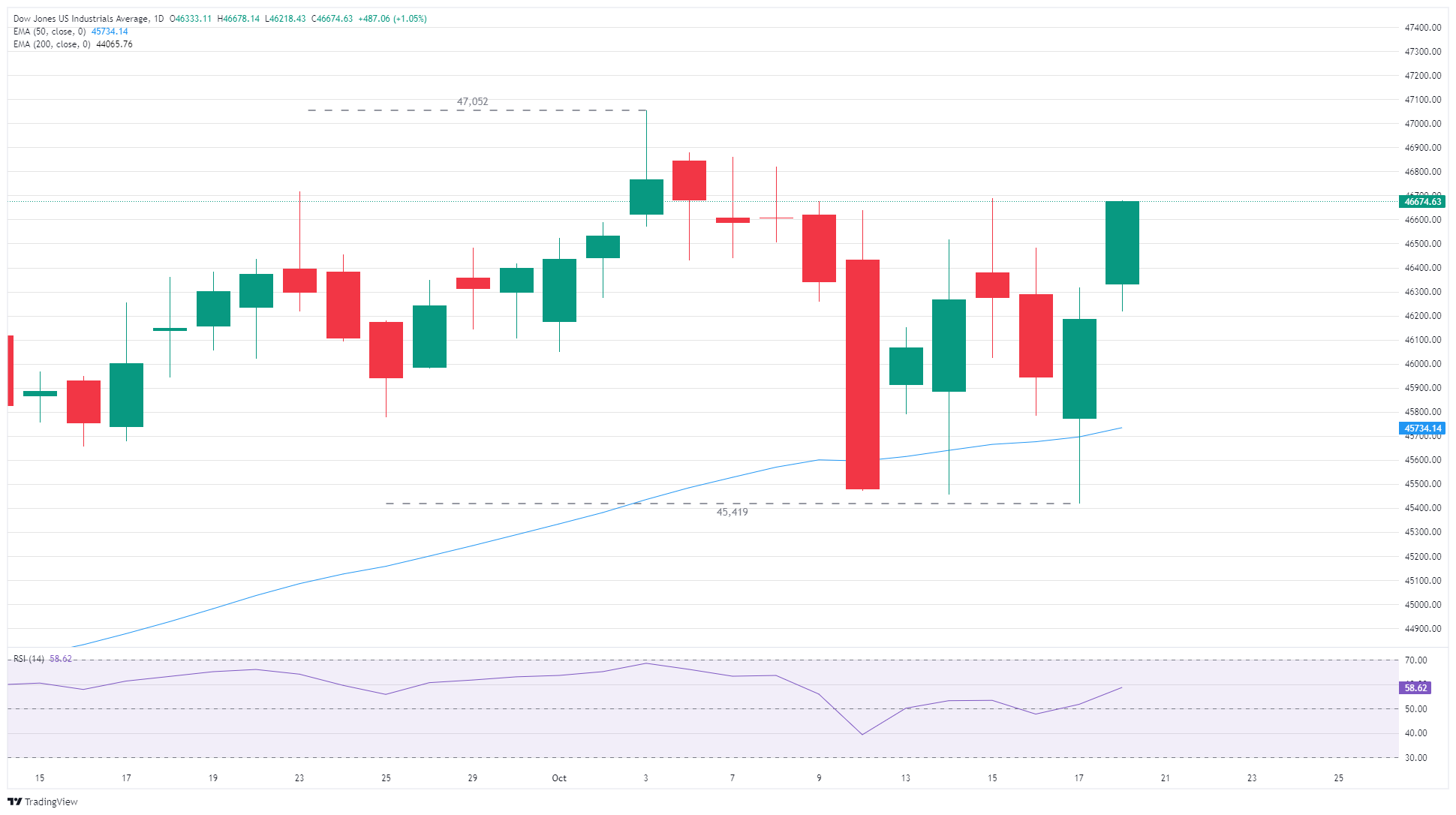 Chỉ số công nghiệp Dow Jones (DJIA) đã nhận được một luồng gió thuận lợi vào thứ Hai, tăng hơn 450 điểm để khởi động tuần giao dịch mới. Cổ phiếu Apple (AAPL) đã tăng mạnh, dẫn đầu đà tăng vào phân khúc cao cấp khi đợt tăng giá công nghệ cho thấy những dấu hiệu sống mới, và các nhà đầu tư hy vọng rằng những tin đồn về khả năng kết thúc tình trạng đóng cửa chính phủ liên bang Mỹ sẽ dẫn đến việc chấm dứt tình trạng đóng cửa liên bang.