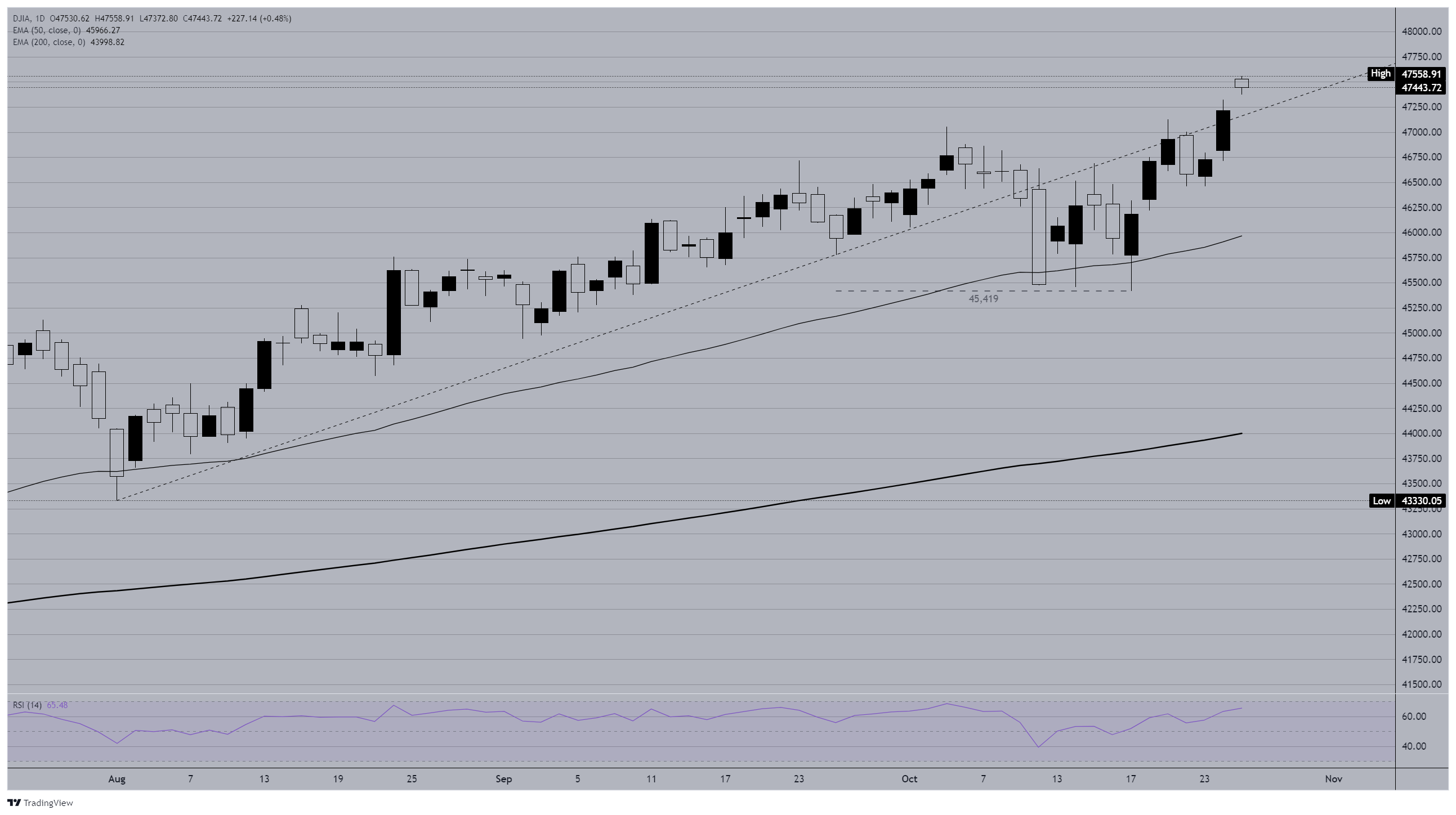 Chỉ số công nghiệp trung bình Dow Jones (DJIA) đã tăng lên mức cao kỷ lục mới trong phiên giao dịch đầu giờ thứ Hai, vượt qua 47.500 lần đầu tiên trong lịch sử khi các nhà đầu tư tiếp tục phục hồi tâm lý. Thị trường đang đặt cược rằng một thỏa thuận thương mại vào phút chót giữa Mỹ và Trung Quốc sẽ tránh được những đợt thuế mà Tổng thống Donald Trump đã đe dọa.