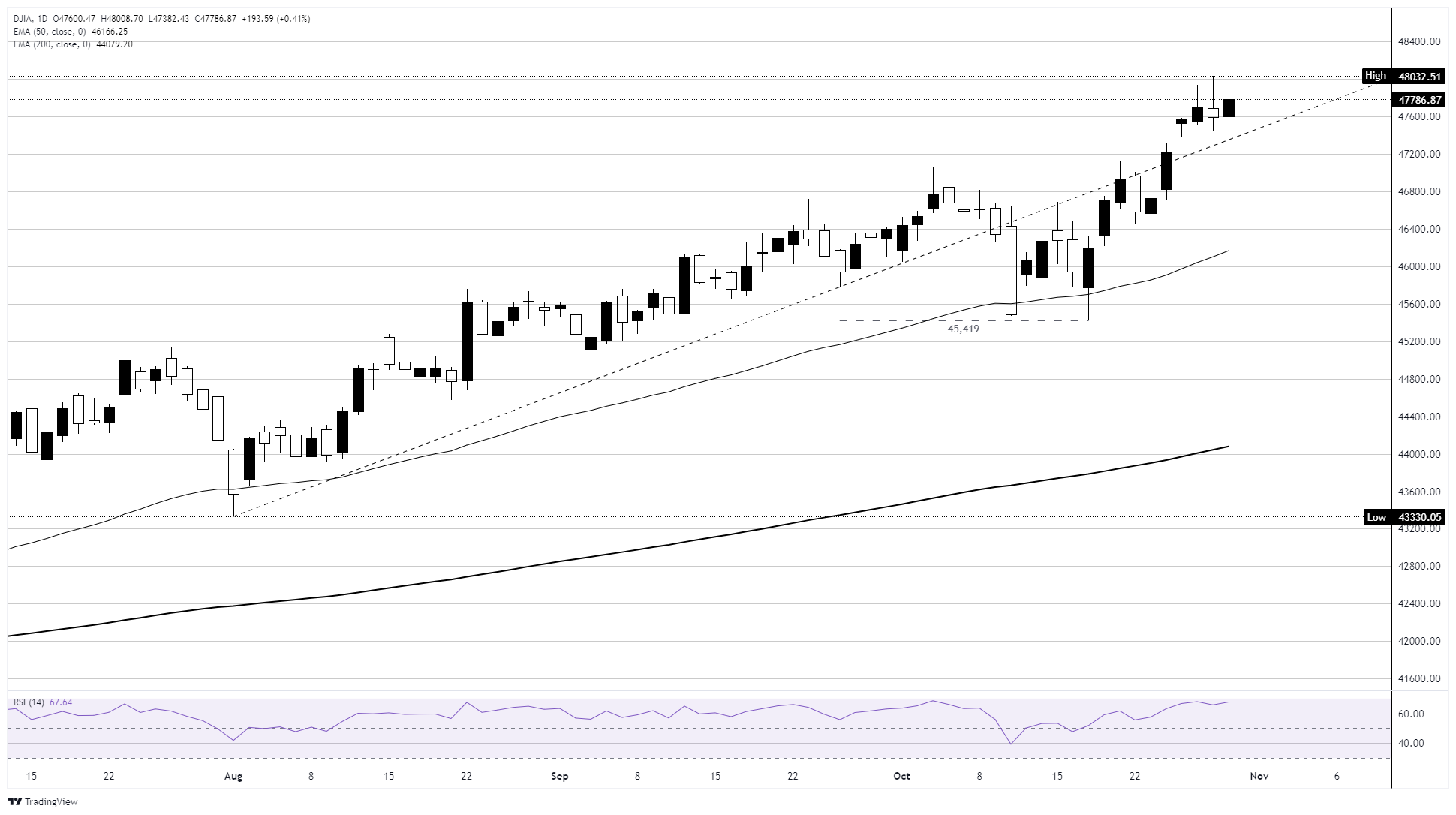 Chỉ số công nghiệp trung bình Dow Jones (DJIA) giữ nguyên vị trí vào thứ Năm, xoay quanh mức cao kỷ lục khi các nhà đầu tư xem xét lại lập trường của họ sau màn xuất hiện gần đây của Cục Dự trữ Liên bang (Fed). Fed đã thực hiện đợt cắt giảm lãi suất 1/4 điểm thứ hai liên tiếp trong tuần này, như nhiều người đã dự đoán. Tuy nhiên, một màn thể hiện rõ ràng thận trọng từ Thống đốc Fed Jerome Powell đã làm tiêu tan hy vọng của thị trường về một đợt cắt giảm lãi suất ba lần vào tháng 12.