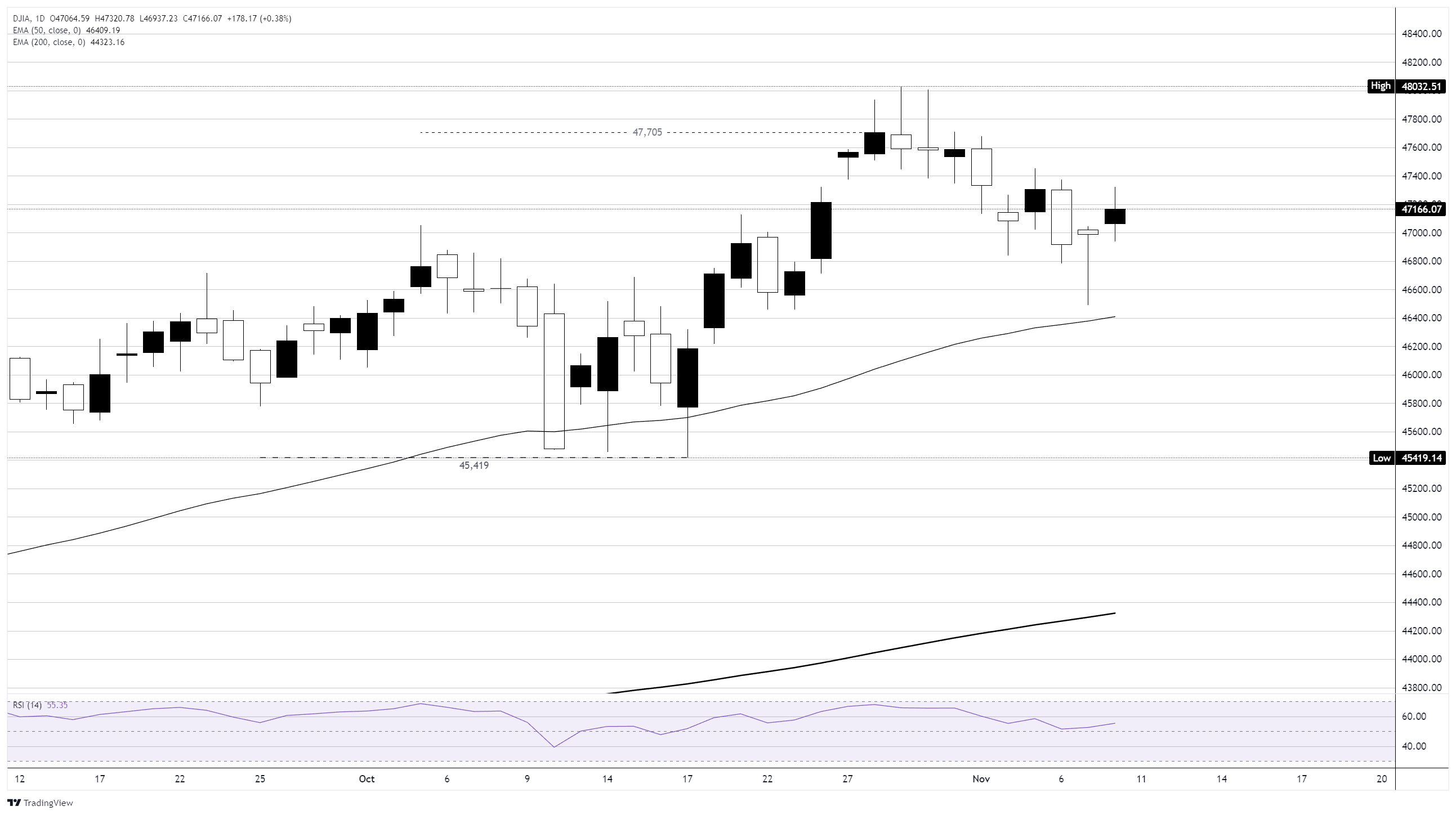 Chỉ số công nghiệp trung bình Dow Jones (DJIA) giữ vững vị thế vào thứ Hai, bắt đầu tuần giao dịch mới gần ngưỡng 47.000. Thị trường chứng khoán đã giảm trong tuần trước khi đợt tăng trưởng công nghệ AI có dấu hiệu chững lại, hoặc ít nhất là tạm nghỉ, và các nhà đầu tư đang tìm kiếm một kết thúc cho việc đóng cửa tài trợ của chính phủ Mỹ, điều này đã trở thành thời gian dài nhất trong lịch sử.