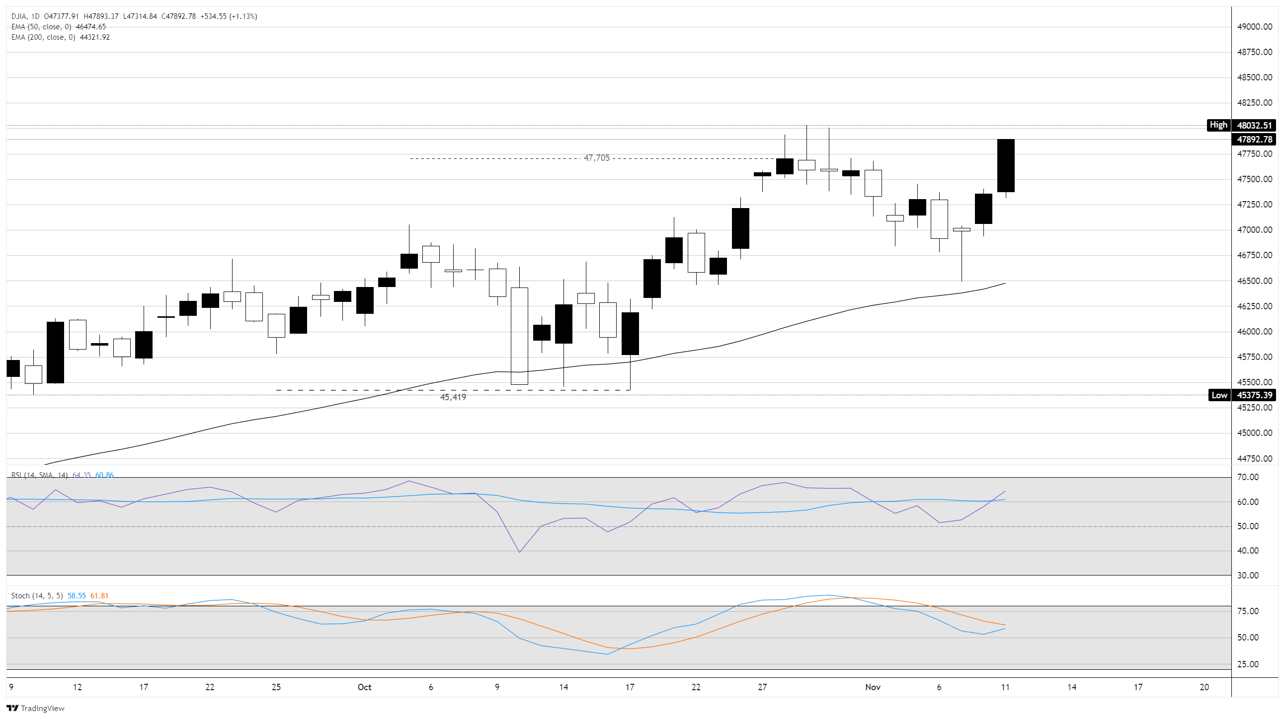 Chỉ số công nghiệp trung bình Dow Jones (DJIA) đã tìm thấy một số không gian để tăng cao hơn vào thứ Ba, bất chấp sự u ám chung đang lan rộng vào các chỉ số chứng khoán lớn khác khi cuộc biểu tình công nghệ AI tiếp tục gặp khó khăn. Dow đã tự khởi động trở lại về khu vực 48.000 khi các nhà đầu tư đặt cược vào một giải pháp để tạm thời tài trợ cho chính phủ Mỹ và khôi phục dòng chảy của các dữ liệu quan trọng về lao động và lạm phát.