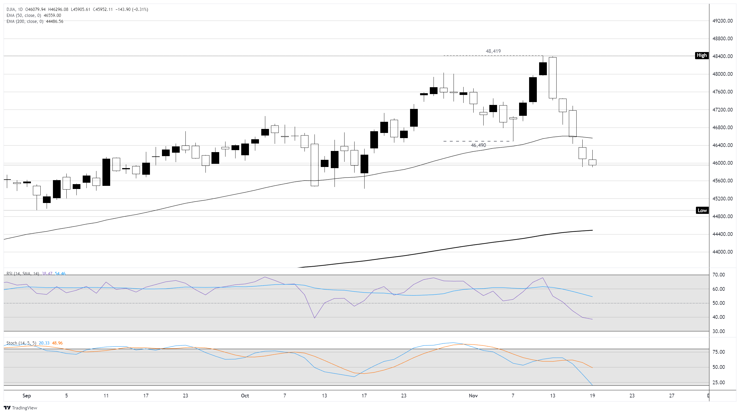 Chỉ số công nghiệp trung bình Dow Jones (DJIA) đã vật lộn để giữ gần như không thay đổi vào thứ Tư, bị mắc kẹt trong xu hướng giảm gần ngưỡng giá chính 46.000. Chỉ số Dow Jones đã giảm trong bốn phiên giao dịch liên tiếp, giảm gần 5% so với mức cao kỷ lục gần 48.420, nhưng áp lực bán ở các cổ phiếu trung bình chủ chốt có thể đã đi quá xa, quá nhanh.