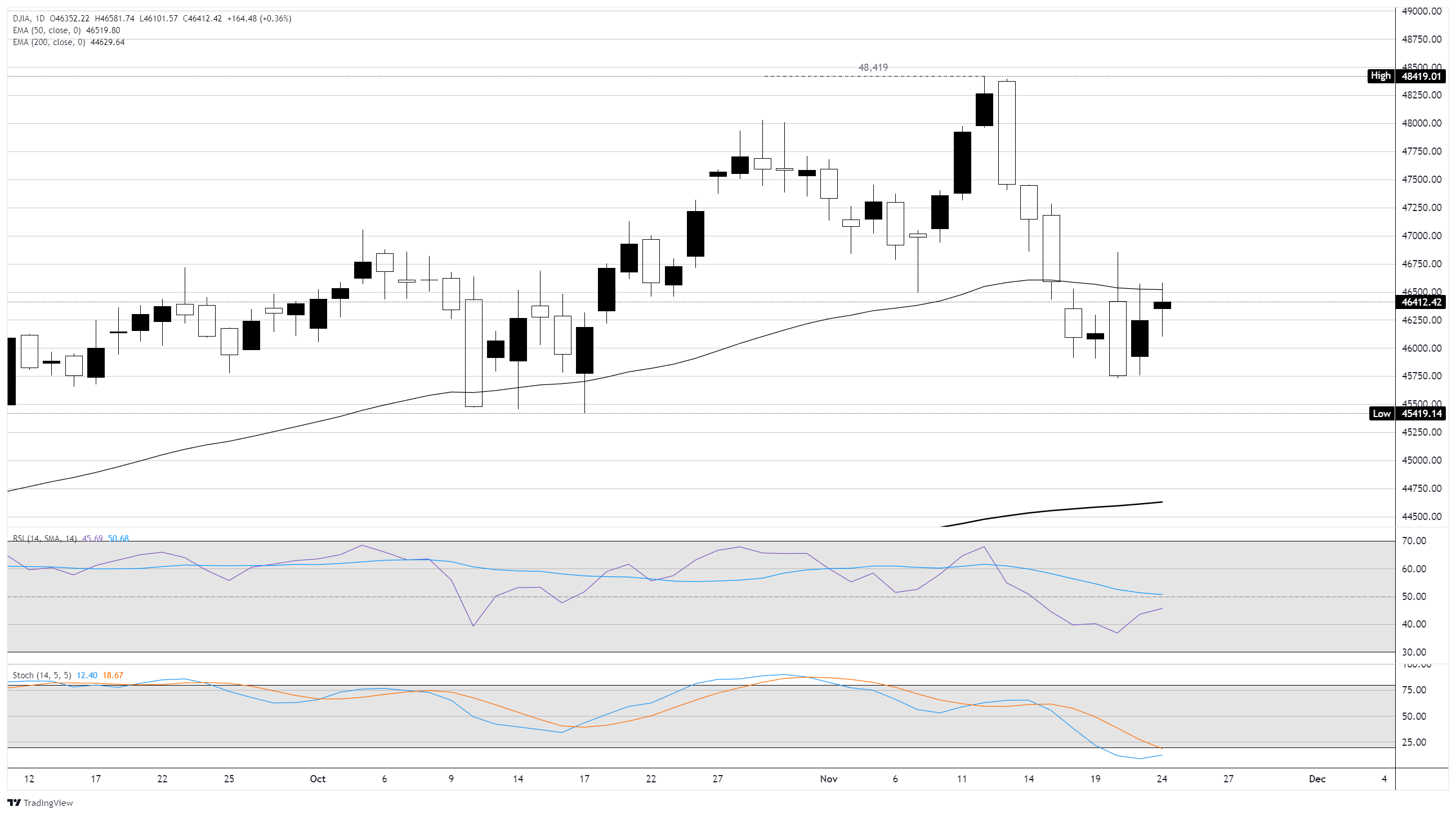 Chỉ số công nghiệp trung bình Dow Jones (DJIA) đã tìm thấy một chút không gian ở phía cao vào thứ Hai, khởi đầu một tuần giao dịch ngắn ngày lễ với mức tăng 200 điểm để lấy lại khu vực 46.500. Các chỉ số chứng khoán nhìn chung đang trong trạng thái phục hồi sau một tuần giao dịch không ổn định vào cuối mùa báo cáo lợi nhuận quý, nhưng các chỉ số chính của Mỹ vẫn chìm trong sắc đỏ trong tháng 11.