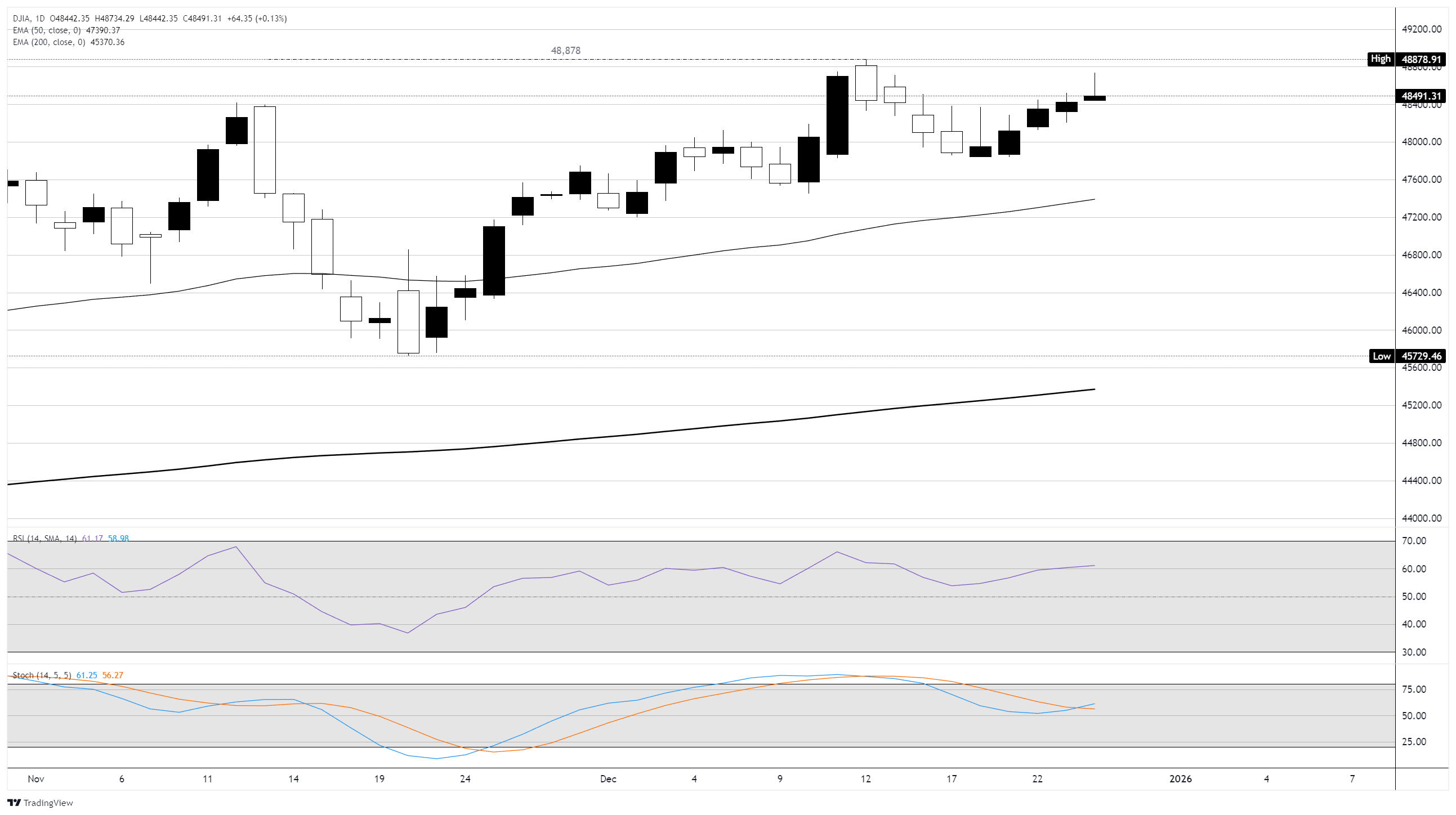 Với đợt tăng giá Santa Claus vào cuối năm giữ cho các mức giá mua được nâng đỡ, chỉ số Dow Jones đang trên đà đóng cửa hoặc là tăng giá hoặc ít nhất là phẳng trong tháng thứ tám liên tiếp, chuẩn bị bước vào năm mới. Mặc dù khối lượng giao dịch vào cuối năm đang giảm, thị trường chứng khoán vẫn nằm sâu trong vùng tăng giá trong năm. Chỉ số Dow Jones đã tăng hơn 14% tính từ đầu năm, trong khi SP500 đang thử nghiệm mức tăng 17,5% so với mức giá mở cửa vào tháng Giêng.