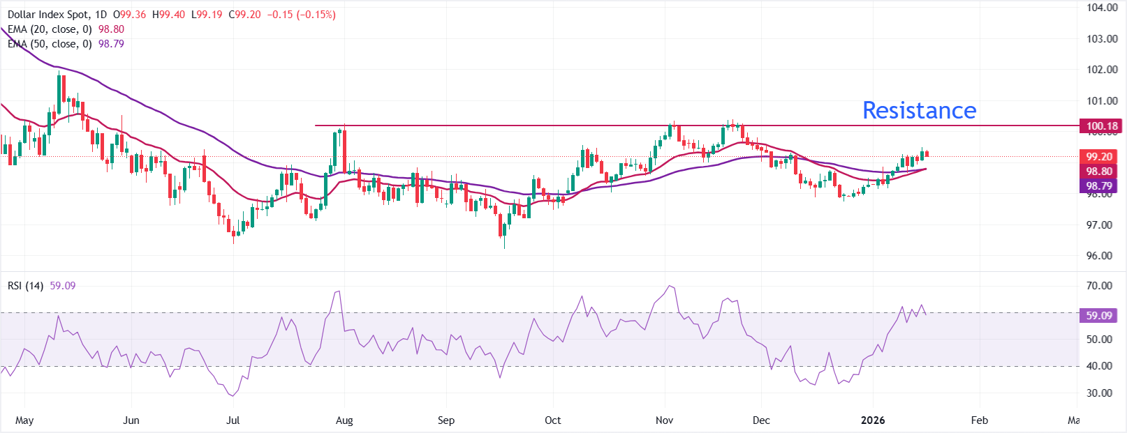 Trên biểu đồ hàng ngày, Chỉ số Dollar Spot giao dịch ở mức 99,20. Giá giữ trên Đường trung bình động hàm mũ (EMA) 20 kỳ đang tăng ở mức 98,80 và EMA 50 kỳ ở mức 98,79, với các đường trung bình này đóng vai trò là hỗ trợ ngay lập tức. EMA 20 kỳ tăng nhẹ trên EMA 50 kỳ, củng cố xu hướng tích cực trong ngắn hạn.