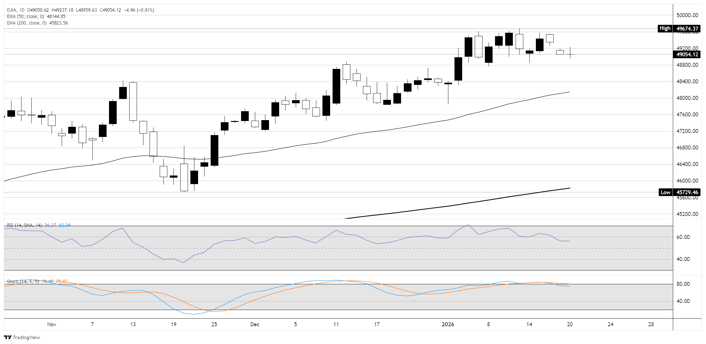 Chỉ số công nghiệp trung bình Dow Jones (DJIA) giảm 1,4%, trong khi S&P 500 và Nasdaq Composite giảm lần lượt 1,6% và 1,8%, đẩy cả hai chỉ số vào vùng tiêu cực trong năm. Chỉ số VIX đã tăng lên trên 20 lần đầu tiên kể từ cuối tháng 11, phản ánh sự gia tăng không chắc chắn. Trump đã phác thảo kế hoạch áp thuế bắt đầu từ 10% đối với hàng nhập khẩu từ tám quốc gia NATO vào ngày 1 tháng 2, tăng lên 25% vào tháng 6, và đe dọa thuế 200% đối với rượu vang và rượu sâm panh của Pháp. Các nhà lãnh đạo châu Âu đã bày tỏ sự phản đối mạnh mẽ và được cho là đang xem xét các biện pháp trả đũa, làm tăng rủi ro về một sự leo thang rộng hơn.