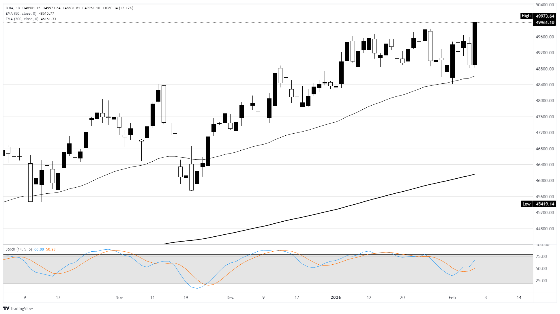 Chỉ số trung bình công nghiệp Dow Jones tăng vọt 1.050 điểm, tương đương 2,15%, để đóng cửa ở mức 49.958,72, mức cao kỷ lục mới vào thứ Sáu khi cổ phiếu phục hồi mạnh mẽ từ đợt bán tháo do công nghệ dẫn dắt vào thứ Năm. Chỉ số S&P 500 tăng 1,2% lên 6.880,13, trong khi chỉ số Nasdaq Composite tăng 1,0% lên 22.765,45. Đợt phục hồi mạnh mẽ diễn ra khi các nhà đầu tư đánh giá lại những lo ngại về sự gián đoạn do trí tuệ nhân tạo và tác động của các kế hoạch chi tiêu khổng lồ từ các công ty Big Tech, với các nhà sản xuất chip và lĩnh vực tài chính dẫn dắt thị trường đi lên.