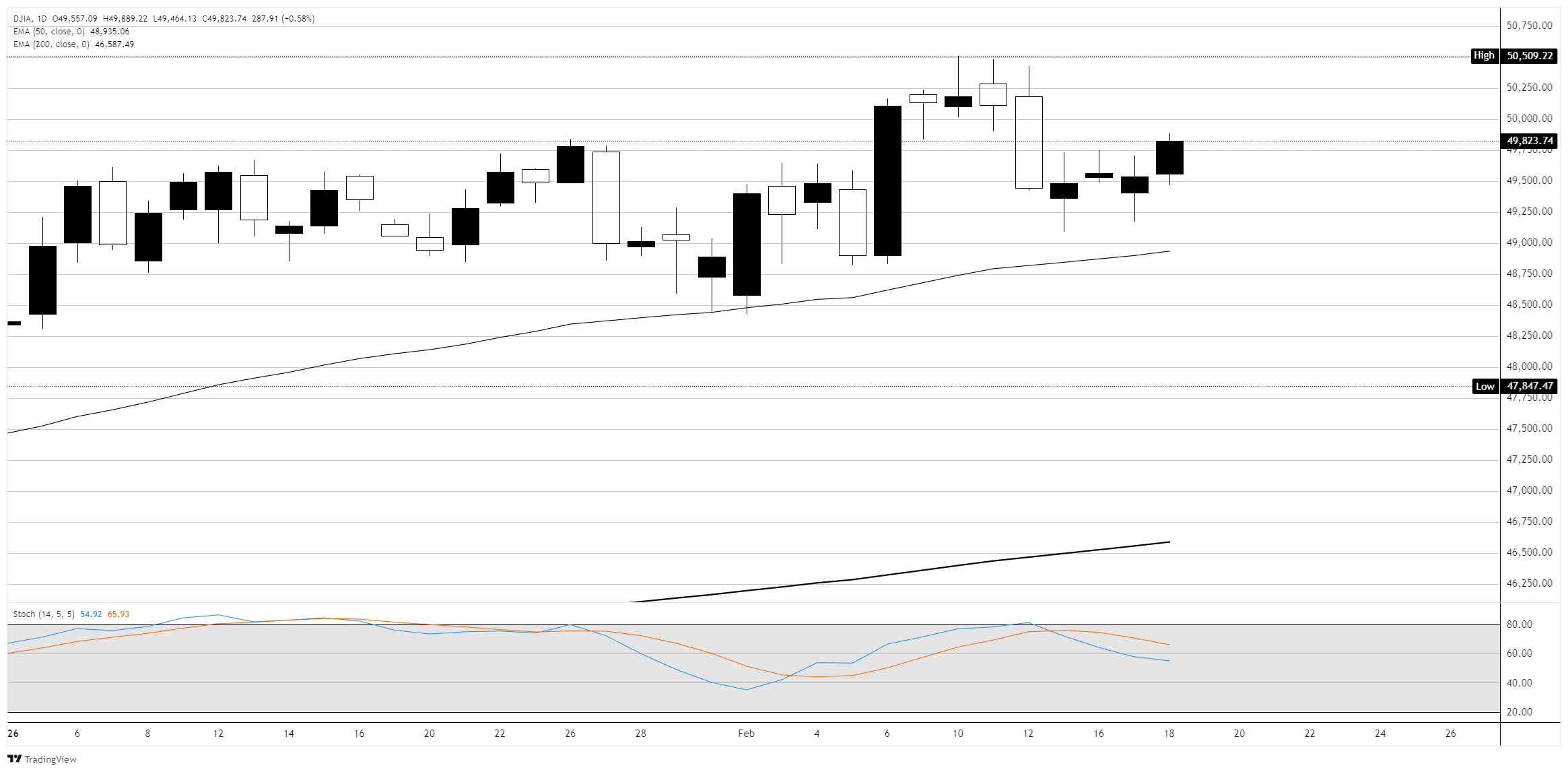 Chỉ số công nghiệp trung bình Dow Jones (DJIA) đã tăng khoảng 300 điểm, tương đương khoảng 0,65%, vào thứ Tư khi các nhà đầu tư mua vào tiếp tục quay trở lại thị trường chứng khoán trong phiên thứ ba liên tiếp sau đợt bán tháo mạnh do AI vào tuần trước. Chỉ số S&P 500 tăng 0,6% và Nasdaq Composite tăng khoảng 0,5%, với các nhà sản xuất chip và các công ty công nghệ lớn bị giảm giá dẫn đầu đà tăng. Các nhà đầu tư đang theo dõi việc công bố biên bản cuộc họp tháng 1 của Cục Dự trữ Liên bang (Fed) vào lúc 2:00 PM ET, điều này có thể cung cấp manh mối về lộ trình lãi suất của ngân hàng trung ương cho phần còn lại của năm 2026. Fed đã giữ lãi suất ở mức 3,5% đến 3,75% trong cuộc họp tháng 1, và các thị trường đang định giá khoảng 90% khả năng không thay đổi vào tháng 3, với Công cụ FedWatch của CME cho thấy đợt cắt giảm lãi suất đầu tiên trong năm không được mong đợi cho đến tháng 6 sớm nhất.