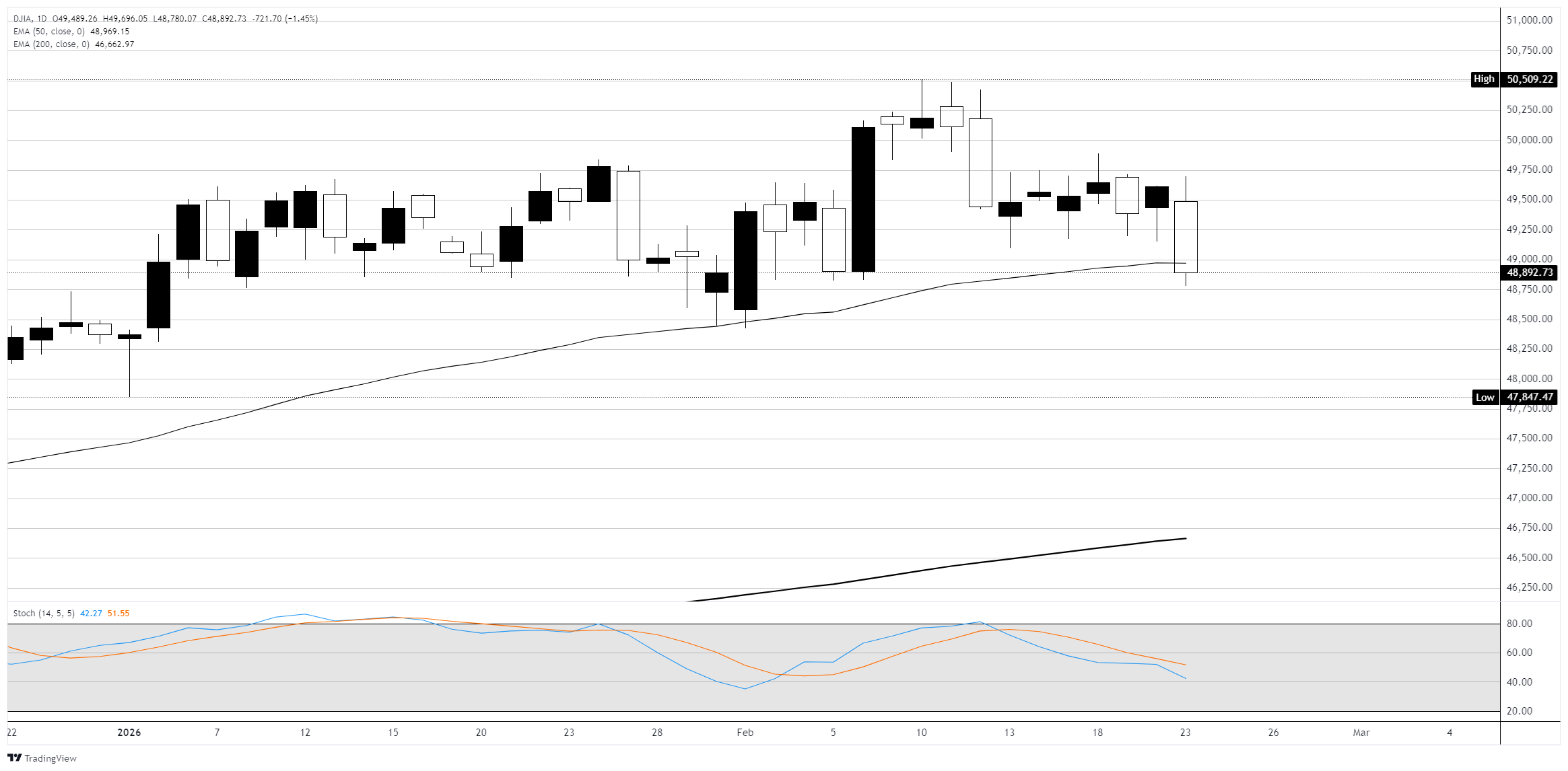 Chỉ số trung bình công nghiệp Dow Jones (DJIA) đã giảm mạnh vào thứ Hai, giảm khoảng 700 điểm hay 1,45% khi sự không chắc chắn về thuế quan mới làm nặng nề tâm lý. Chỉ số S&P 500 giảm 0,6% trong khi Nasdaq Composite giảm 0,7%. Quyết định của Tổng thống Trump vào cuối tuần qua về việc tăng thuế quan toàn cầu mới theo Điều 122 từ 10% lên mức tối đa 15% — một động thái được thực hiện vài ngày sau khi Tòa án Tối cao Mỹ bác bỏ các thuế quan rộng rãi mà ông áp dụng theo Đạo luật Quyền Kinh tế Khẩn cấp Quốc tế (IEEPA) — đã khiến thị trường cắt giảm các vị thế rủi ro. Các đối tác thương mại lớn của Mỹ đã chỉ ra rằng họ có thể xem xét lại các thỏa thuận đã được ký kết trước đó theo khung thuế quan hiện đã bị vô hiệu hóa, làm tăng thêm sự không chắc chắn. Mức thuế 15% được giới hạn trong 150 ngày theo Điều 122, có nghĩa là Quốc hội sẽ cần hành động để gia hạn nó, và chính quyền đã đánh dấu kế hoạch khởi động các cuộc điều tra theo Điều 301 để thiết lập một cấu trúc thuế quan bền vững hơn.