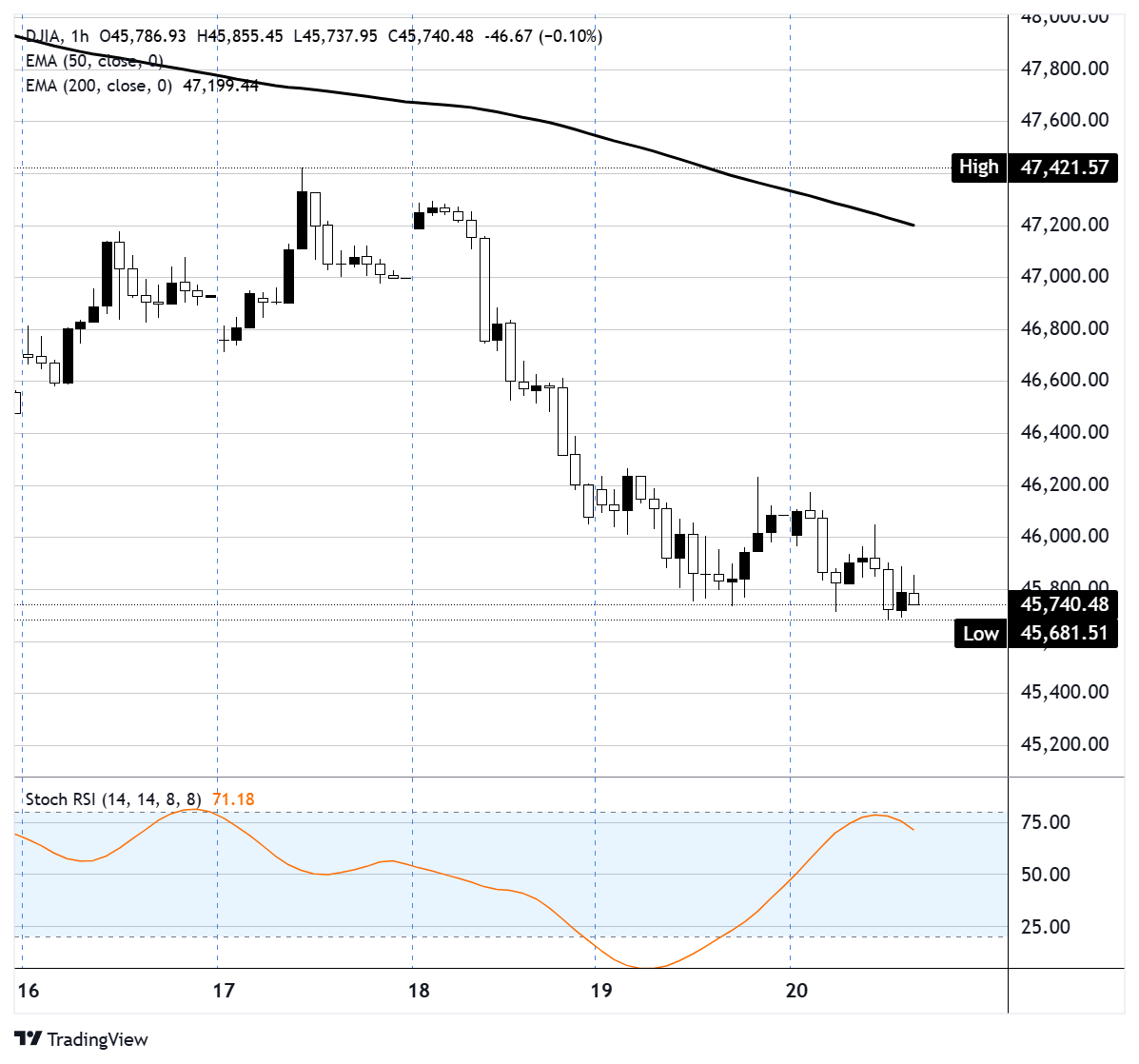 Biểu đồ theo giờ cho thấy câu chuyện rõ ràng. Dow đạt đỉnh gần 47.400 đầu tuần trước khi quyết định của FOMC kích hoạt đợt sụt giảm khoảng 1.700 điểm xuống mức thấp hàng tuần gần 45.700 vào thứ Năm — mức thấp nhất trong năm của chỉ số. Dow tăng nhẹ vào thứ Ba nhưng chịu mất 768 điểm vào thứ Tư sau quyết định của FOMC và dữ liệu lạm phát nóng hơn dự kiến. Thứ Năm chứng kiến sự hồi phục một phần khi giá Dầu giảm từ mức cao trong phiên sau khi Thủ tướng Israel Benjamin Netanyahu cho biết Israel đang giúp Mỹ mở lại Eo biển Hormuz, nhưng đà bật lên này nhanh chóng phai nhạt và áp lực bán tiếp tục vào thứ Sáu. Giá hiện đang giao dịch thấp hơn nhiều so với cả đường trung bình động hàm mũ (EMA) 50 kỳ giảm nhanh và EMA 200 kỳ gần 47.200, xác nhận xu hướng giảm. Chỉ báo Stochastic RSI đã hồi phục lên gần 72 từ vùng quá bán sâu, nhưng với mức kháng cự trên đầu như vậy, đà bật lên có vẻ hạn chế. Trong tuần, Dow giảm khoảng 1,5%, S&P 500 mất khoảng 0,9%, và Nasdaq giảm khoảng 0,8%. Cả Dow và Nasdaq hiện đang tiến gần đến vùng điều chỉnh, lần lượt thấp hơn 8,6% và hơn 8% so với mức đóng cửa kỷ lục của chúng. Jim Reid của Deutsche Bank lưu ý rằng thứ Sáu đánh dấu ngày giao dịch thứ 15 của xung đột, đây là điểm trung bình lịch sử mà chứng khoán Mỹ chạm đáy sau một cú sốc địa chính trị. Tuy nhiên, ông cảnh báo rằng các tiêu đề tin tức sẽ quan trọng hơn lịch sử do mức độ không chắc chắn hiện tại. Ở phía bên kia, CEO Unlimited Bob Elliott cho rằng thị trường vẫn quá lạc quan về tác động của chiến tranh đối với lợi nhuận và nền kinh tế, lưu ý rằng các hộ gia đình thực tế đang mất đi 1% đến 2% sức mua thực dù xung đột có được giải quyết ngay lập tức.