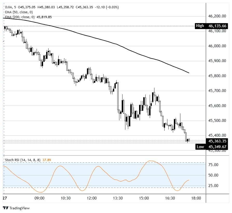 Chỉ số công nghiệp trung bình Dow Jones giảm mạnh vào thứ Sáu, mất khoảng 510 điểm hay 1,1% để rơi xuống dưới mức 45.500 và chính thức bước vào vùng điều chỉnh. Chỉ số S&P 500 giảm khoảng 1%, đưa mức giảm từ đỉnh kỷ lục của nó lên trên 8%, trong khi Nasdaq Composite giảm 1,3% sau khi đã bước vào vùng điều chỉnh một ngày trước đó. Đợt giảm vào thứ Sáu đánh dấu tuần giảm thứ năm liên tiếp của thị trường rộng lớn, chuỗi giảm dài nhất kể từ năm 2022, khi các gián đoạn tại Eo biển Hormuz và sự suy giảm niềm tin vào một giải pháp ngoại giao với Iran đã giữ chặt tâm lý chấp nhận rủi ro.