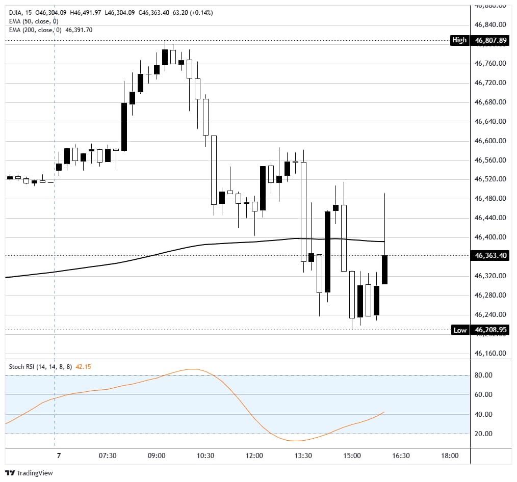 Chỉ số công nghiệp trung bình Dow Jones (DJIA) giảm khoảng 380 điểm, tương đương 0,8%, chấm dứt chuỗi bốn phiên tăng liên tiếp khi khẩu vị rủi ro sụp đổ trong những giờ trước hạn chót do Tổng thống Trump tự đặt ra để Iran đồng ý mở lại Eo biển Hormuz. Chỉ số S&P 500 giảm 0,9% và Nasdaq Composite mất 1,3%, với mức giảm tăng tốc sau khi New York Times đưa tin Iran đã ngừng đàm phán ngừng bắn với Mỹ. DJIA mở cửa gần mức cao phiên trên 46.800 trước khi bán tháo đều đặn trong buổi chiều, phá vỡ dưới đường trung bình động 200 kỳ và đóng cửa gần 46.300.