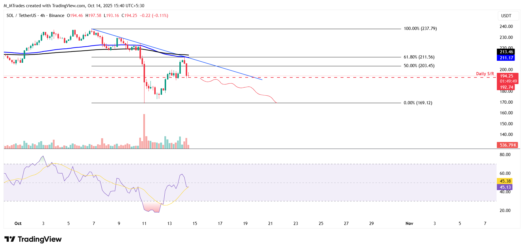 On Friday, Solana’s price on the 4-hour chart faced rejection from the descending trendline (drawn by joining multiple highs since October 6) and declined more than 19% by Saturday. However, SOL recovered slightly in the next two days. At the time of writing on Tuesday, SOL faced rejection from the trendline and trades below $200. This trendline roughly coincides with the 100-day Exponential Moving Average (EMA) at $211.17 and the 61.8% Fibonacci retracement level at $211.56, making this a key resistance level.