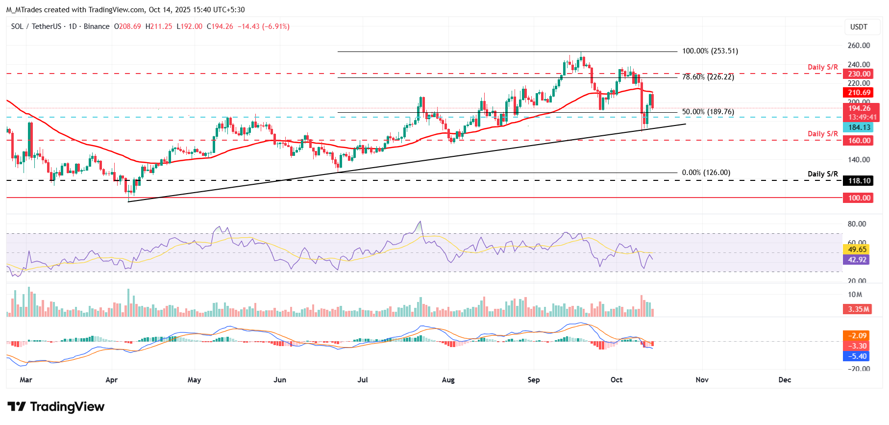 Solana (SOL) price trades below $200 at the time of writing on Tuesday, after facing rejection from the key resistance zone. The broader crypto market came under pressure as escalating US-China trade tensions fueled risk aversion among investors. Technical indicators for SOL hint at a possible short-term correction, with price action suggesting that a dead-cat bounce scenario may be unfolding.