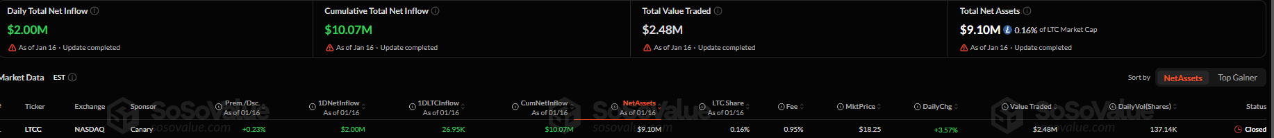 Another bearish sign for LTC is fading institutional demand for its Spot Exchange Traded Funds (ETFs). SoSoValue data shows that Canary, which launched LTC spot ETFs, has accumulated only $9.10 million net assets as of Tuesday, compared to Solana (SOL) and Ripple (XRP), which have total net assets of $1.21 billion and $1.52 billion, respectively. This highlights Litecoin’s relatively weak institutional traction compared to other major altcoins, suggesting limited ETF-driven demand to support prices in the near term.