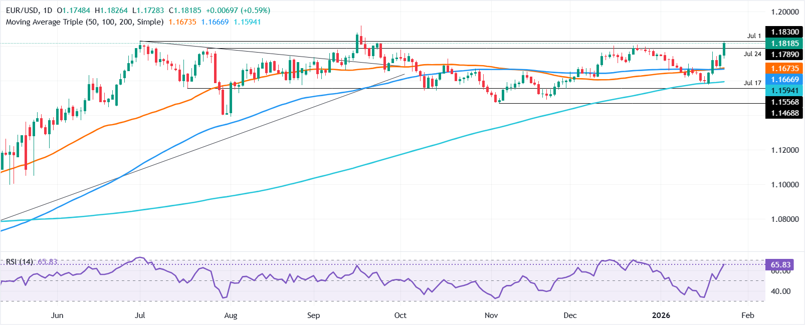 Hình ảnh kỹ thuật của EUR/USD cho thấy sự bứt phá khỏi đường xu hướng dốc xuống được vẽ từ các mức cao hàng ngày của tháng 9 và tháng 12, đã được xóa ở mức khoảng 1,1775, đẩy cặp tiền này vượt qua mức 1,1800 để đạt mức cao nhất trong năm là 1,1826.