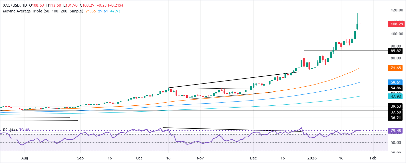 Trong trường hợp đó, mức hỗ trợ đầu tiên của XAG/USD sẽ là mức thấp hàng ngày 96,14$ vào ngày 23 tháng 1, tiếp theo là mức thấp 90,46$ vào ngày 21 tháng 1.
