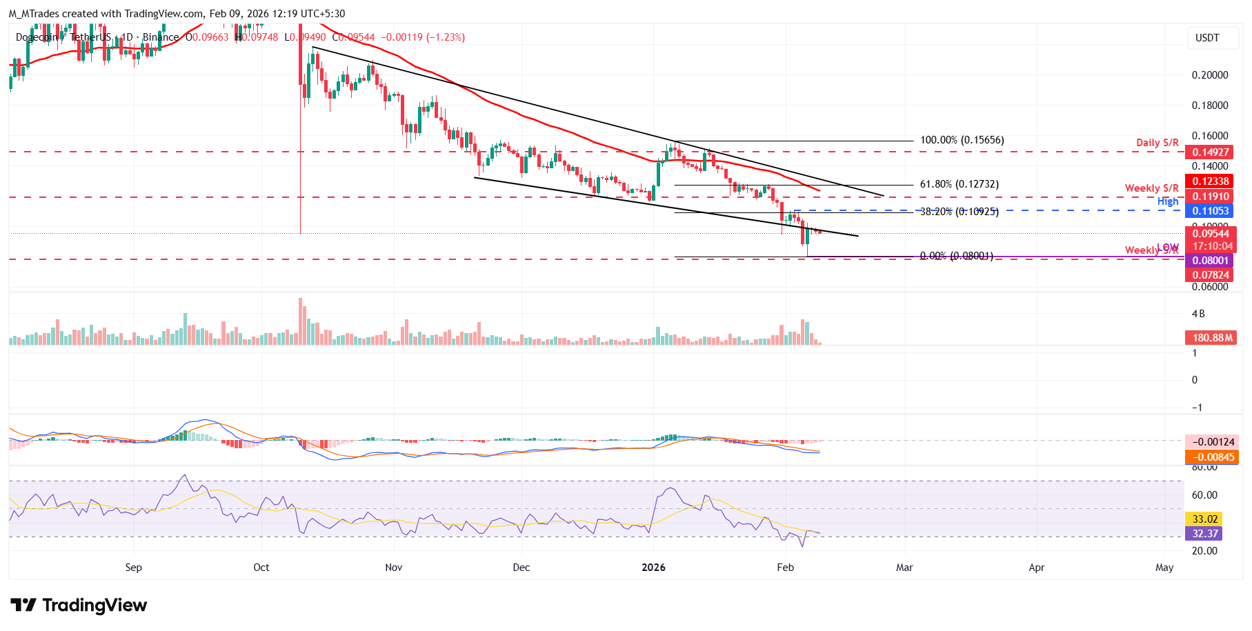 Dogecoin (DOGE) price trades in red, hovering near $0.095 at the time of writing on Monday, after falling over 7% in the previous week. On-chain data shows that certain whales have accumulated DOGE at recent dips, suggesting easing selling pressure and signaling short-term price stabilization. The technical outlook shows fading weakness in the momentum indicators, suggesting a potential recovery if DOGE climbs back above a lower trendline resistance.