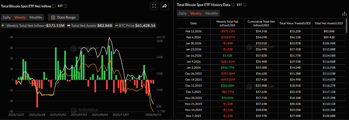 Institutional demand for Bitcoin continues to weaken. According to SoSoValue data, spot Bitcoin ETFs outflows remained robust through Thursday, totalling $375.11 million. These withdrawals point to a fourth consecutive weekly outflow, failing to support BTC prices. If this trend continues, BTC could see further correction in the upcoming weeks.