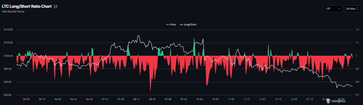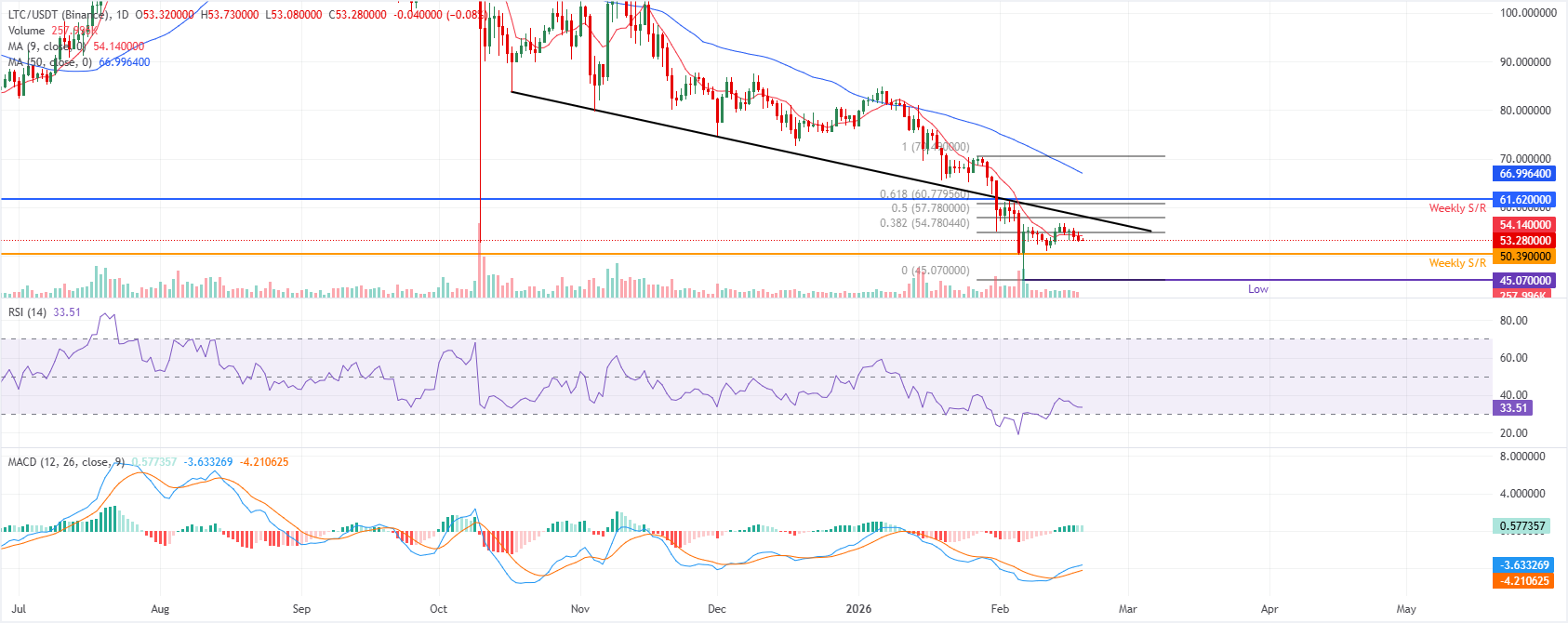 Litecoin's trades at $53.28 as of writing on Thursday. The 9-day Simple Moving Average (SMA) at $54.14 remains below the 50-day SMA at $66.99, with both sloping lower to underscore a bearish setup.