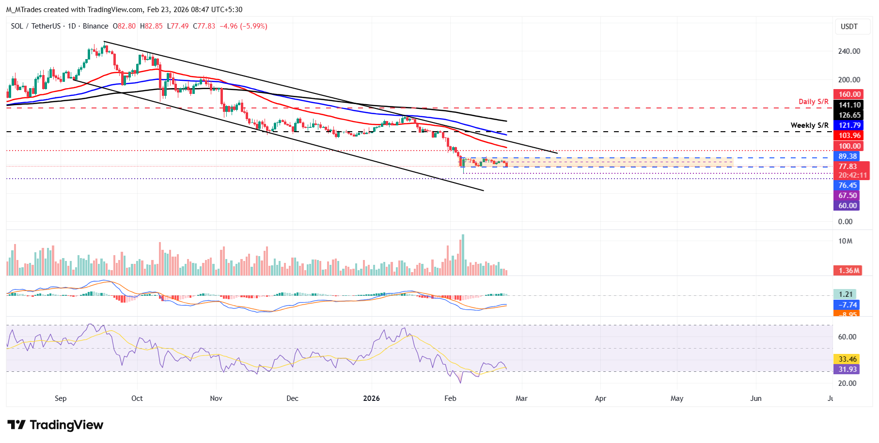 If SOL closes below the lower consolidation boundary at $76.45 on a daily basis, it could extend further losses toward the February 6 low at $67.50.