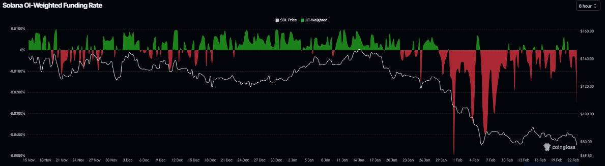 Solana (SOL) price slips 6%, nearing the lower end of its consolidation range at $76.45 at the time of writing on Monday. A firm close below this level suggests a deeper correction. The derivatives data supports a bearish sentiment with SOL’s short bets rising alongside negative funding rates. On the technical side, if downside momentum continues, SOL may revisit its February 6 low around $67.50.