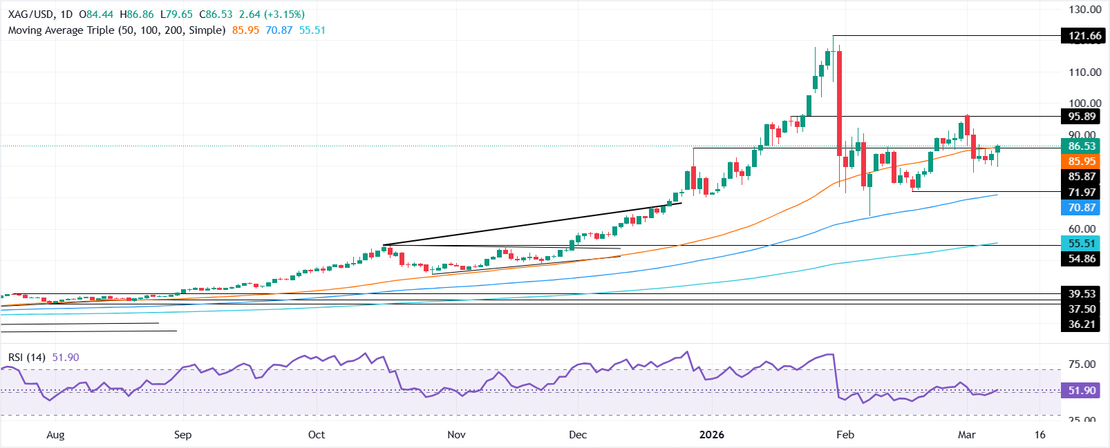 Bức tranh kỹ thuật của Bạc cho thấy XAG/USD đang hợp nhất trong phạm vi 80,00$-96,50$, với cả người mua và người bán đều không thể phá vỡ đỉnh/thấp của khu vực đó. Động lượng đang có lợi cho phe đầu cơ giá lên, như được mô tả bởi Chỉ báo sức mạnh tương đối (RSI), nhưng vẫn còn yếu.