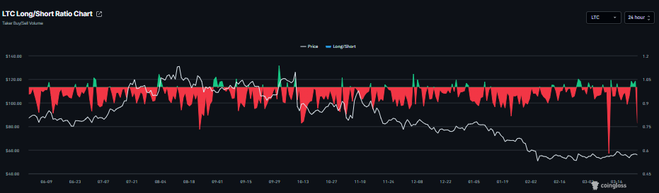 Litecoin (LTC) is trading in the red, slipping below $58 at the time of writing on Thursday, and faces rejection at a key level. Weakening derivatives metrics support a bearish sentiment, while technical analysis suggests a deeper correction in the near term.