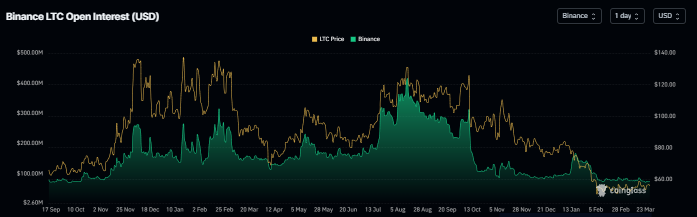 Litecoin’s futures Open Interest (OI) at Binance exchange dropped to $74.69 million on Thursday and has been continuously falling since mid-January. This drop in OI reflects waning investor participation and projects a bearish outlook.