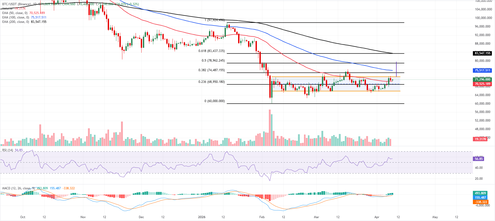On the downside, initial support aligns with the 50-day EMA around $70,525, ahead of the 23.6% Fibonacci level at $68,950. A break below there would expose the lower channel boundary near $65,872, with the broader structural floor stemming from the $60,000 swing low further down.
