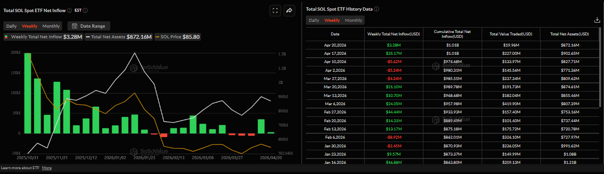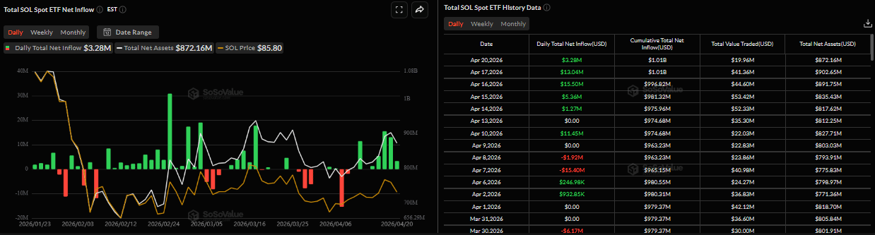 • US-listed SOL spot ETFs recorded an inflow of $3.28 million on Monday, marking the fifth consecutive day of positive flows.