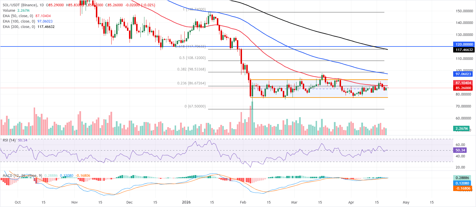 Solana is trading at $85.27 on Tuesday, up over 2% from the previous day. SOL nears the key 50-day Exponential Moving Average (EMA) at $87.10, where a close above suggests a bullish move.