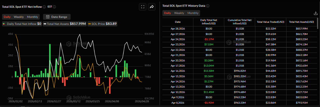 In addition, institutional demand, as shown in the chart below, has remained muted so far this week. SoSoValue data indicates that spot SOL Exchange Traded Funds (ETFs) have seen little to no activity. If these flows turn negative in the coming days, it could add further selling pressure and trigger a deeper correction in SOL price.