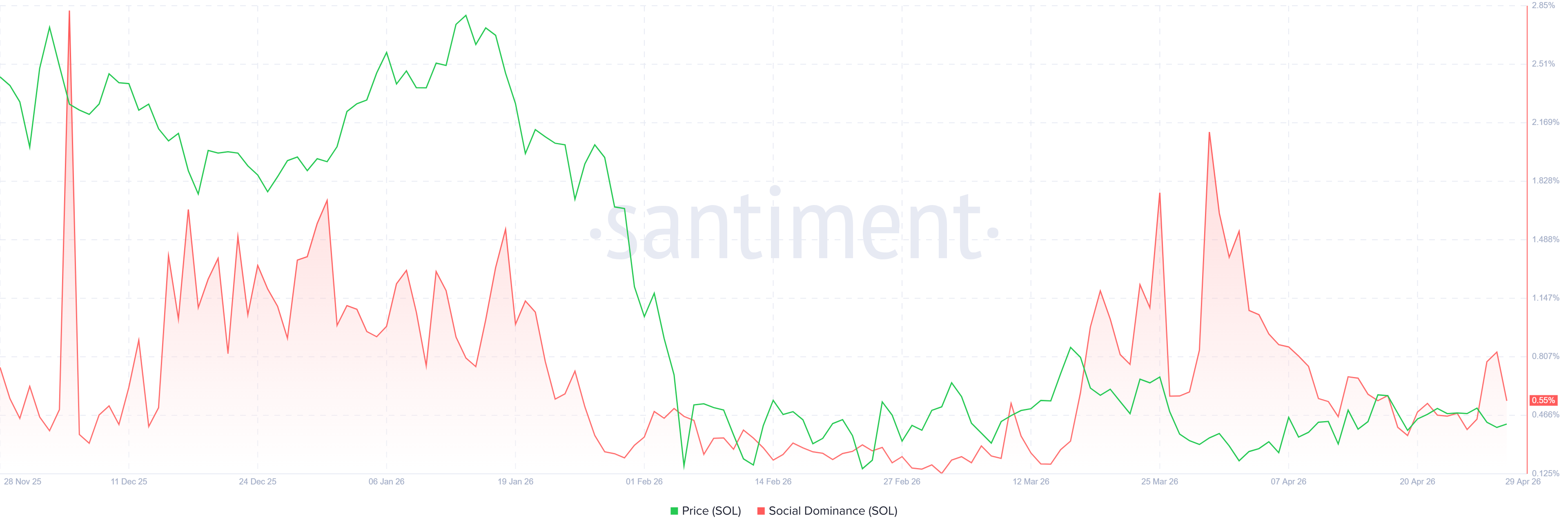 Santiment’s Social Dominance metric for Solana supports a bearish outlook. The index measures the share of SOL-related discussions across the cryptocurrency media. It fell sharply, reading 0.55% on Wednesday. This fall indicates fading market interest and weakening sentiment among SOL investors.