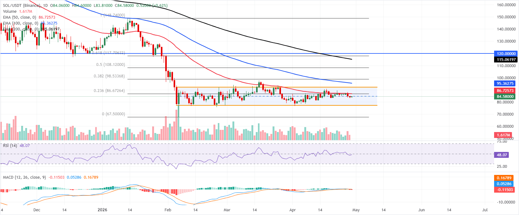 Solana price is trading at $84.58 on Wednesday, keeping a bearish near-term bias as price holds below the 50-day, 100-day and 200-day Exponential Moving Averages (EMAs) clustered well above the market, with the 50-day EMA capping near $86.72 and the 100-day and 200-day EMAs reinforcing overhead supply around $95.36 and $115.06, respectively.