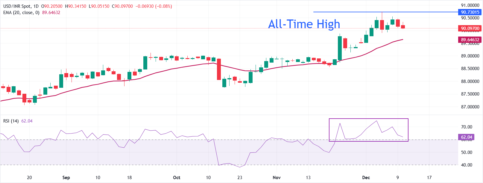 Đồng Rupee Ấn Độ (INR) tăng thêm so với Đô la Mỹ (USD) vào thứ Tư. Cặp USD/INR giảm xuống gần 90,00 khi Đồng Rupee Ấn Độ phục hồi sau thông báo rằng Đại diện Thương mại Phó Mỹ Rick Switzer sẽ đến Ấn Độ vào ngày 10-11 tháng 12 để thúc đẩy các cuộc thảo luận thương mại.