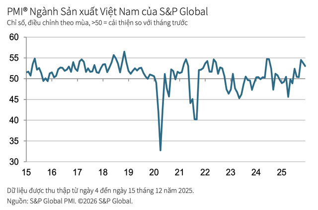 Ngành sản xuất của Việt Nam đã kết thúc năm 2025 với những tín hiệu tăng trưởng tích cực khi Chỉ số Nhà Quản trị Mua hàng (PMI) đạt 53 điểm, đánh dấu sự cải thiện liên tục về điều kiện kinh doanh trong suốt nửa cuối năm.