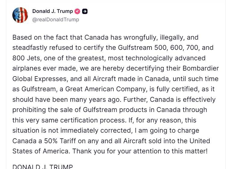 Tổng thống Mỹ Donald Trump vào thứ Năm đã đe dọa áp đặt mức thuế 50% đối với tất cả các máy bay được bán từ Canada vào Hoa Kỳ (Mỹ), cáo buộc Canada đã không công bằng trong việc chặn chứng nhận các máy bay phản lực thương mại Gulfstream.