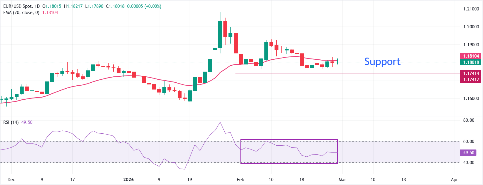 EUR/USD giao dịch đi ngang quanh mức 1,1800 tại thời điểm báo chí. Cặp này củng cố gần Đường trung bình động hàm mũ (EMA) 20 ngày, đã đi ngang quanh mức 1,1810, cho thấy sự mất mát về độ thuyết phục hướng đi sau đợt tăng trước đó. Hành động giá đã dừng lại dưới khu vực 1,19 gần đây, trong khi Chỉ số sức mạnh tương đối (RSI) 14 ngày đã giao dịch trong khoảng 40,00-60,00, cho thấy động lượng trung lập. Tổng hợp lại, các bằng chứng chỉ ra một xu hướng trung lập trong ngắn hạn.
