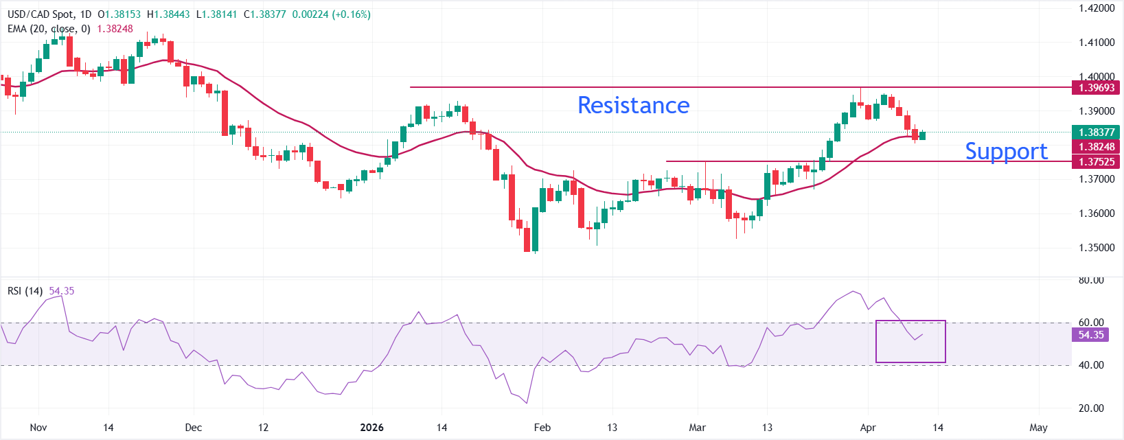USD/CAD giao dịch cao hơn 0,15% ở mức khoảng 1,3840 trước khi dữ liệu việc làm Canada được công bố. Cặp tiền này chấm dứt chuỗi giảm bốn ngày sau khi thu hút lực mua gần mức thấp nhất trong hai tuần là 1,3800.