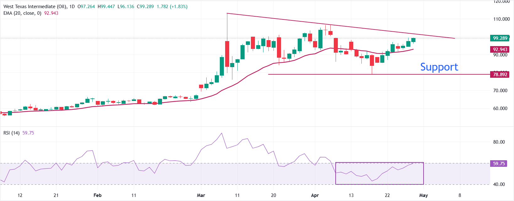 Dầu WTI Mỹ giao dịch cao hơn ở mức khoảng 99,20$, duy trì xu hướng tăng tích cực khi vẫn nằm trên đường trung bình động hàm mũ 20 ngày (EMA) ở khoảng 92,94$.